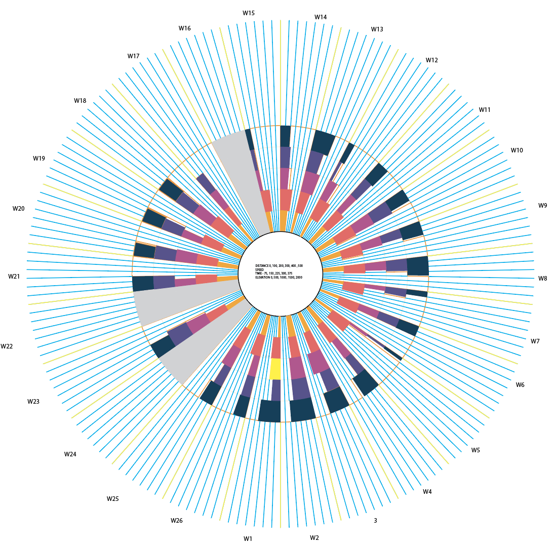 As this question centralised around identifying the existence of a “relationship”, key themes I wanted my visualisation to convey were comparisons and timelines - it was integral that the reader was able to compare the cycling data over the 26-week time period. The biggest challenge I faced was that my dataset was very multidimensional and contained a variety of different measurement units, compounded by the element of showing this not once, but across 26 different instances.